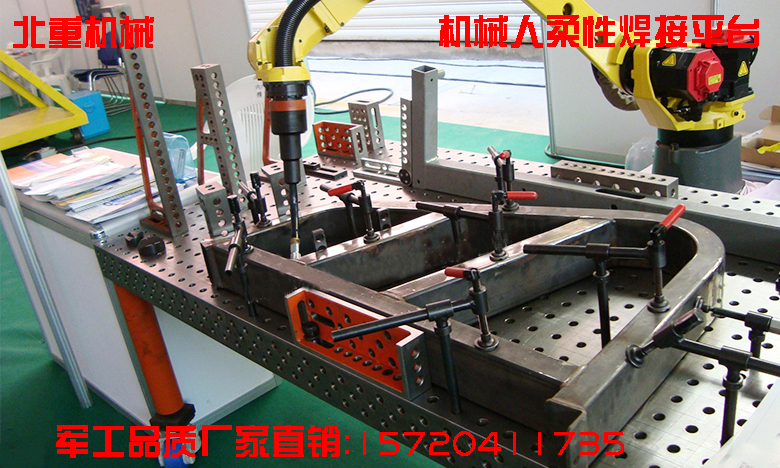 柔性組合工裝夾具是一種三維平面孔系定位夾緊系統,采用標準化、系列化、通用化的模塊組成,所有模塊的鏈接、固定和壓緊都是以孔來(lái)定位,用鎖緊銷(xiāo)來(lái)實(shí)現快速鎖緊,模塊與模塊隨著(zhù)機器人的應用越來(lái)越廣泛,自動(dòng)化程度的不斷提高,傳統的裝配、焊接工藝裝備已經(jīng)很難適應生產(chǎn)的要求;經(jīng)過(guò)我們不斷的實(shí)驗創(chuàng )新,研發(fā)出機器人焊接平臺,從此提高生產(chǎn)效率、降低生產(chǎn)成本、提高產(chǎn)品質(zhì)量。利用專(zhuān)用夾具附件完成實(shí)現產(chǎn)品的高效率、低成本的生產(chǎn)。